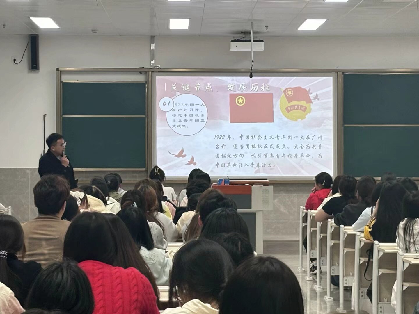 本次团课以“团史辉映,青春向党”为主题,以共青团的发展历程为主线,围绕星火燎原、建设征程、改革奋进和新时代篇章等四个部分展开。李老师强调共青团在青年成长中的关键作用,鼓励同学们积极向团组织靠拢,坚定理想信念。在课上,围绕“团的光辉历史、基本任务和团员权利义务”展开讲解,通过讲述五四运动中青年学生的爱国行动,让入团积极分子们深刻理解共青团的使命与担当。