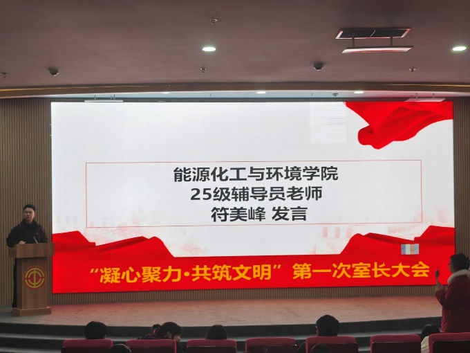 为规范宿舍日常秩序、筑牢住宿安全防线、营造文明整洁的宿舍环境,12 月 1 日下午,能源化工与环境学院于学术报告厅召开 “凝心聚力・共筑文明” 第一次室长大会。团总支负责人李佳、25 级辅导员及学院全体室长参会。